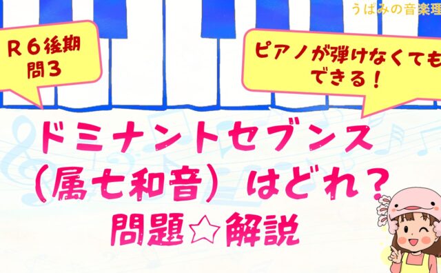 解ける音楽理論☆ドミナントセブンスを探せ!過去問で特訓(令和6年度後期保育実習理論問3) 保育実習理論問3で出題される和音問題の過去問の解説その③「属七和音(ドミナントセブンス)を探せ!」問題の解き方を解説します(*^-^*)問3和音問題の出題は3パターンあります! 長3和音(メジャーコード)を探せ:R6前期、R5前期、R4前期... 保育実習理論音楽理論