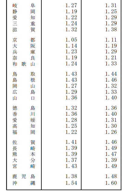 一番多いのは沖縄県ですが、それでも人口置換水準には届かない数値です。