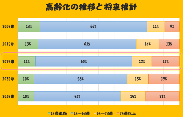 2025年度では、後期高齢者は総人口の17%ですが、10年後の2035年度には19%になると考えられています。これから先、どうなっちゃうんでしょうね・・・。