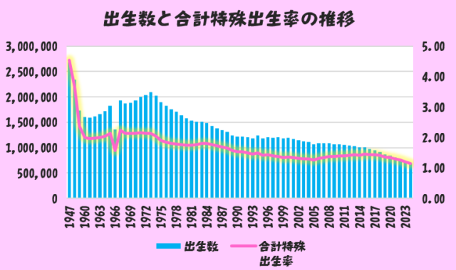 2015年には1.45まで回復していた「合計特殊出生率」ですが、その後減少に転じ、2022年、2023年、2024年と、過去制定を更新し続けています( ;∀;)