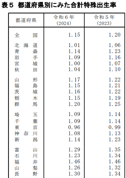 - 2023年の合計特殊出生率は「1.20」。2024年は「1.15」