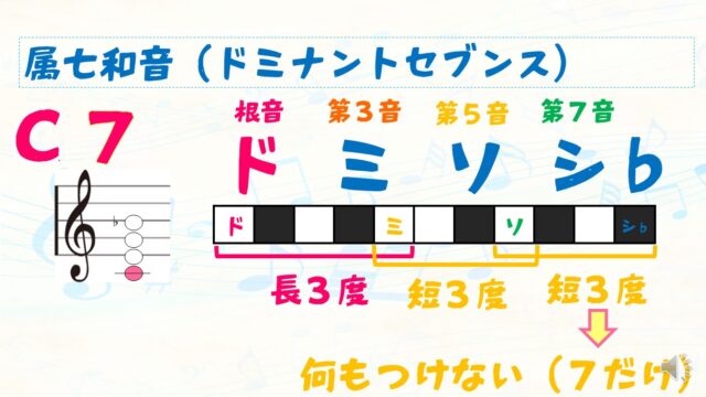 「C7」のように長3度+短3度+短3度で構成されている和音を「属七和音(ドミナントセブンス)」と呼んでいます。