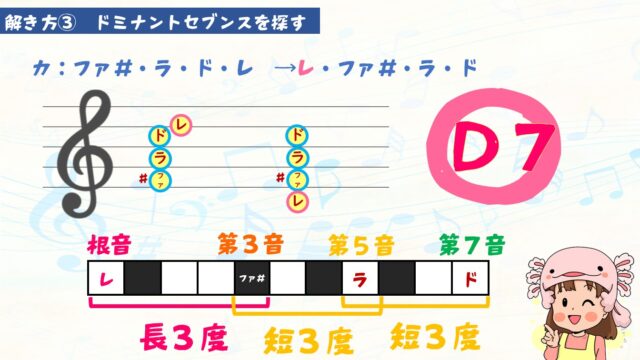 カ(レ・ファ#・ラ・ド)は、長3度+短3度+短3度なので、属七和音(ドミナントセブンス)とわかります。