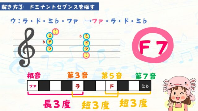 ウ(ファ・ラ・ド・ミ♭)は、長3度+短3度+短3度なので、属七和音(ドミナントセブンス)とわかります。
