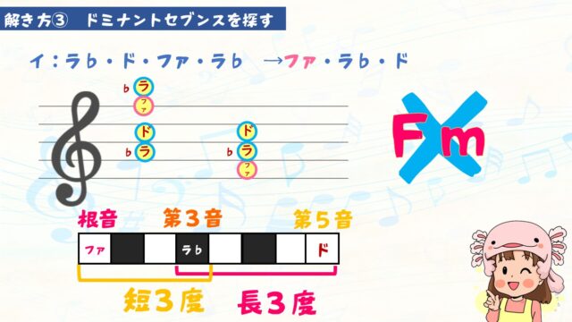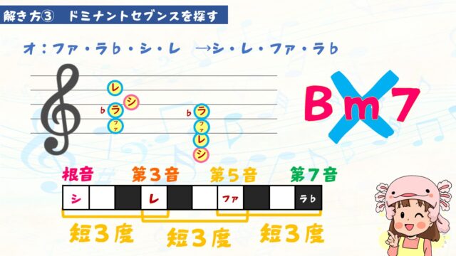 オ(シ・レ・ファ・ラ♭)は、短3度+短3度+短3度なので、短七和音(マイナーセブンス)とわかります。