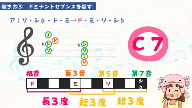 ア(ド・ミ・ソ・シ♭)は、長3度+短3度+短3度なので、属七和音(ドミナントセブンス)とわかります。